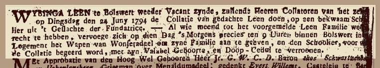 Oproep gerechtigden Wijbengaleen voor de begeving op 24 juni 1794