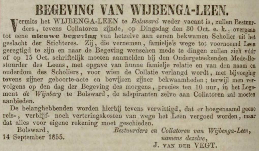 Oproep gerechtigden Wijbengaleen voor de begeving op 30 oktober 1855